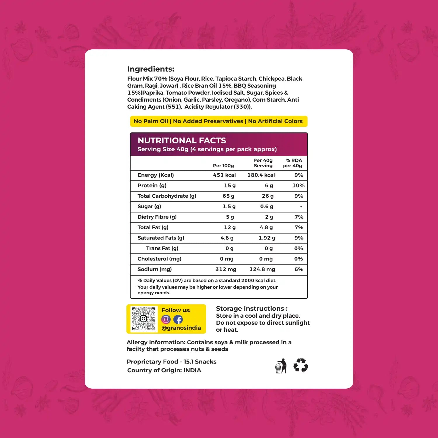 Defatted Soy Flour 65%, Rice Bran Oil 12%, BBQ Seasoning 23%