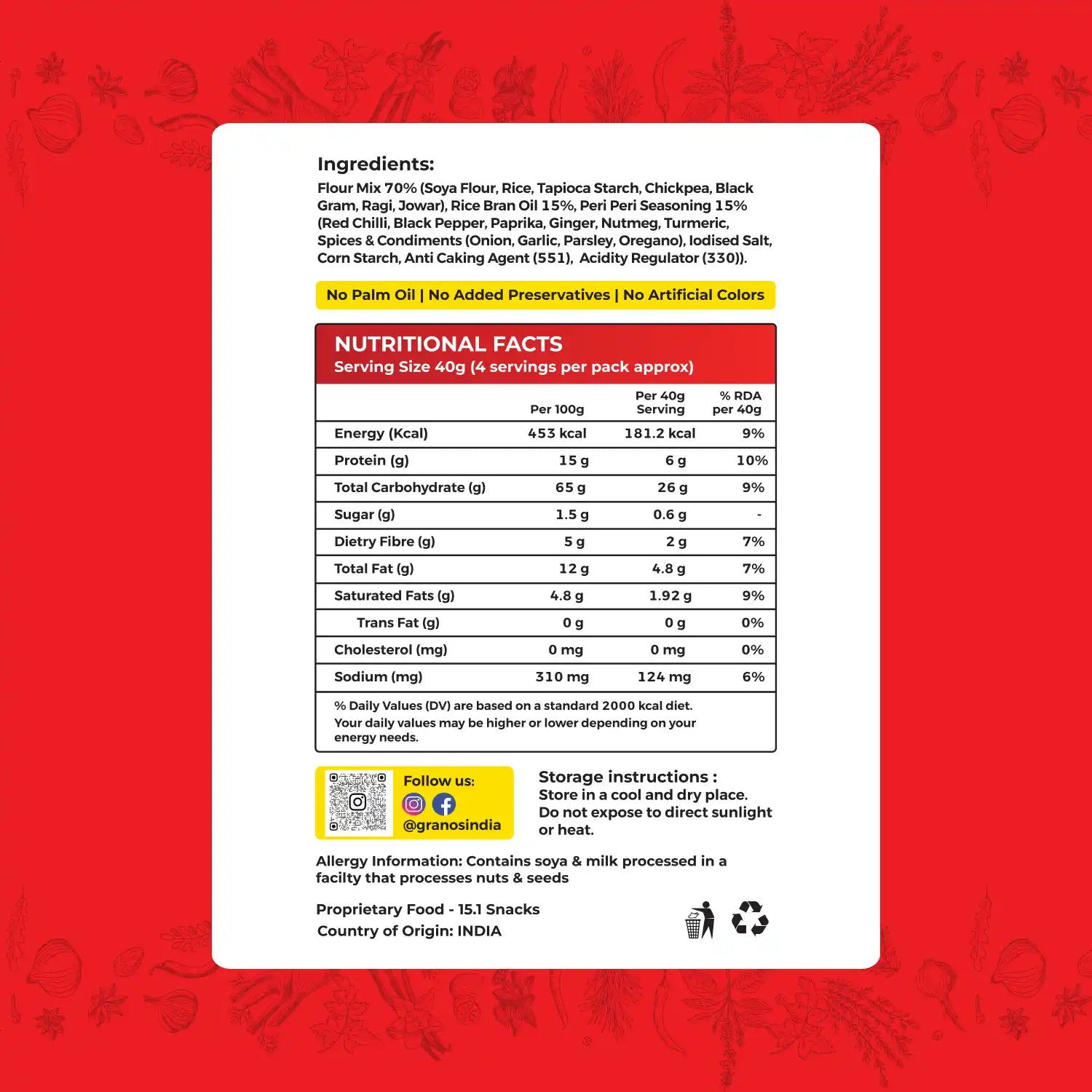 Defatted Soy Flour 65%, Rice Bran Oil 12%, Peri Peri Seasoning 23%