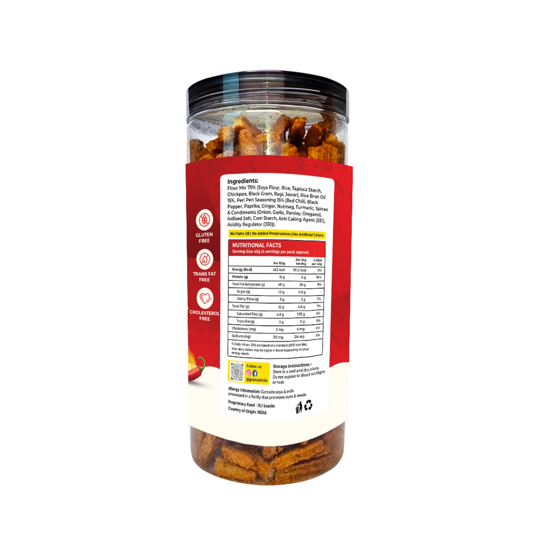 The Peri Peri seasoning is crafted from a mix of red chilies, garlic, lemon zest, and secret spices, delivering an irresistible fiery kick that spice lovers will adore. Whether you’re enjoying them at work, during your gym session, or at home while binge-watching your favorite series, these baked soy sticks will never disappoint!