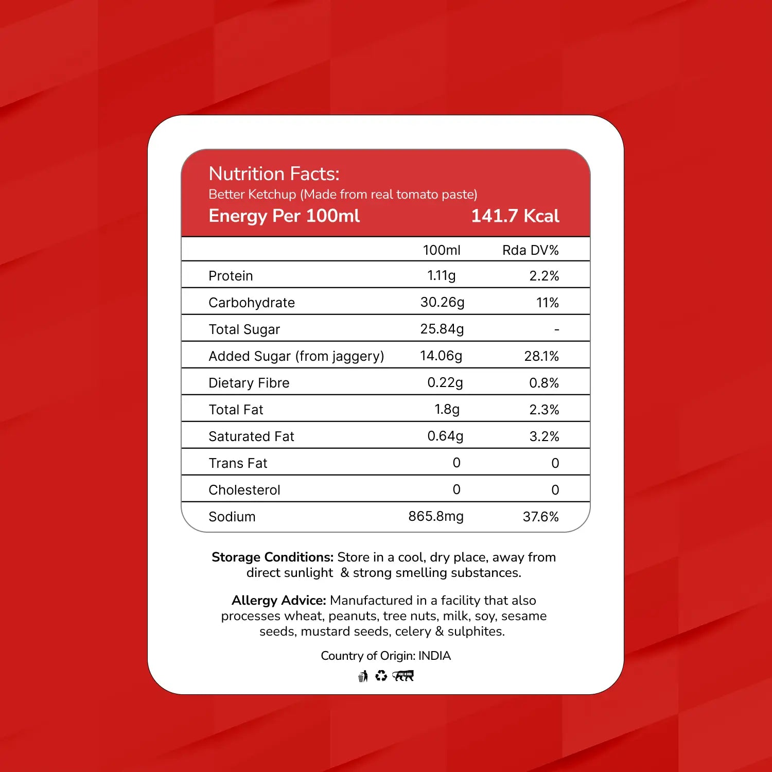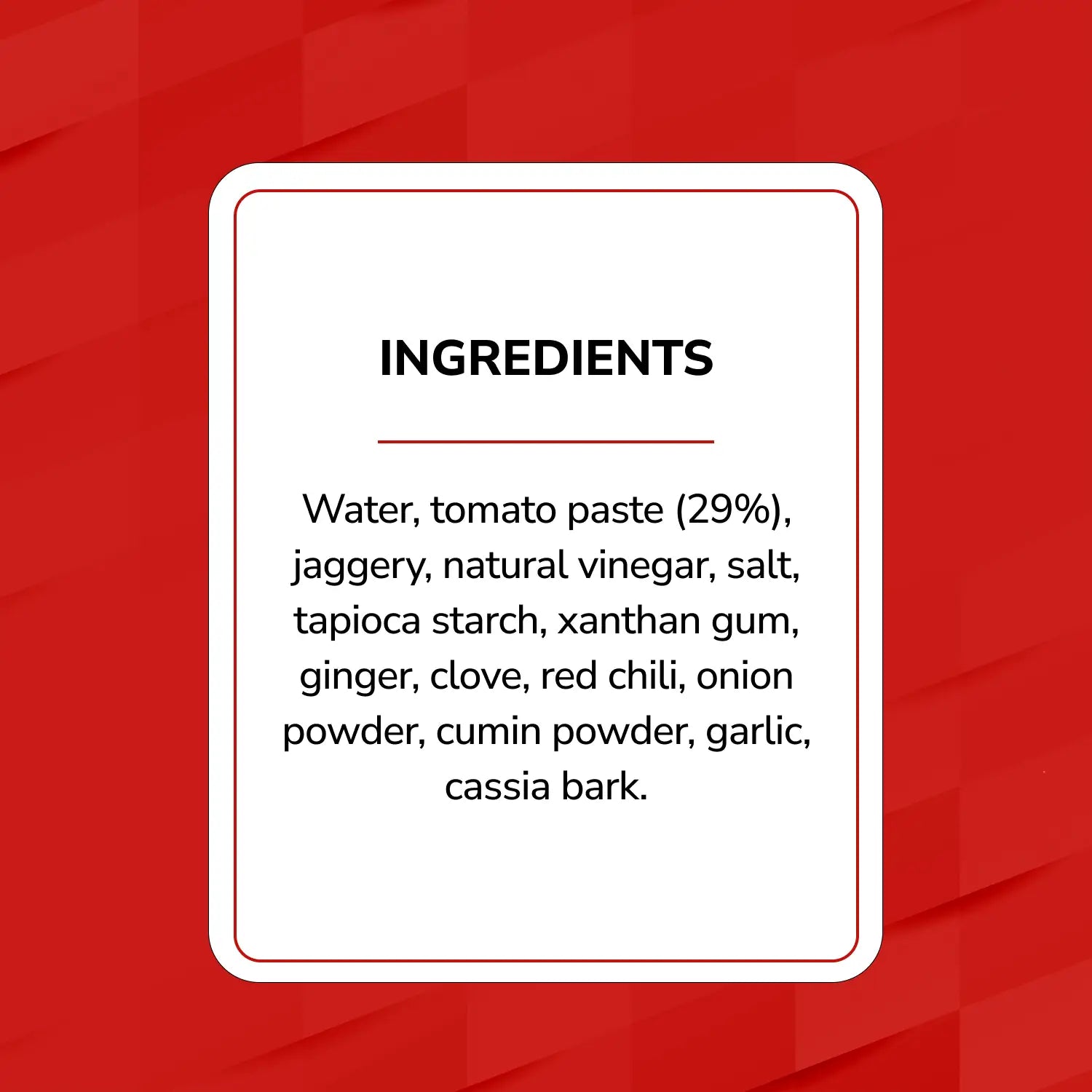 Tomato Paste 70%, Water 15%, Jaggery 10%, Rock Salt 2%, Vinegar 2%, Spices & Condiments 1%
