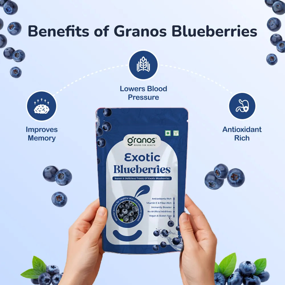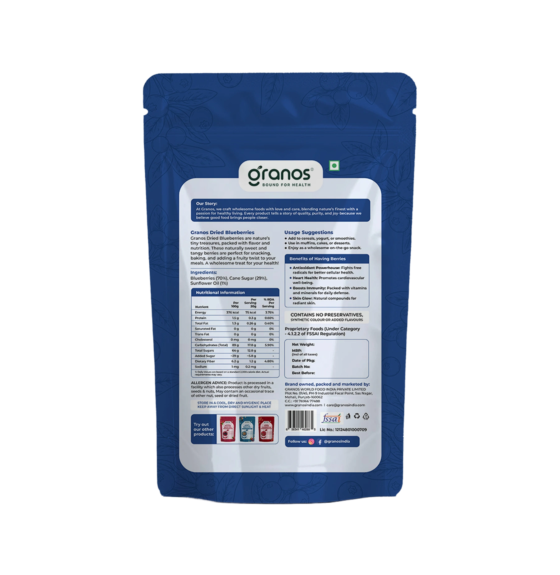 Granos Dried Blueberries offers a convenient way to enjoy the goodness of blueberries year-round. Sourced from premium farms in the USA, these dried blueberries are preserved naturally, which enhances their natural tart-sweet balance. Known for their high antioxidant content, blueberries are a superfood rich in essential vitamins like Vitamin C, fiber, and manganese, which promote overall health and well-being.