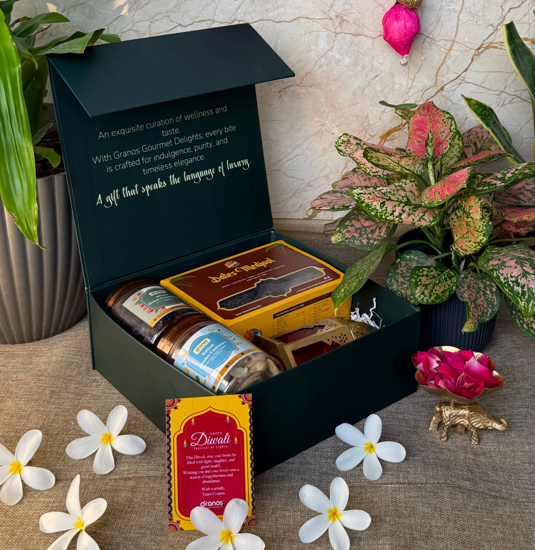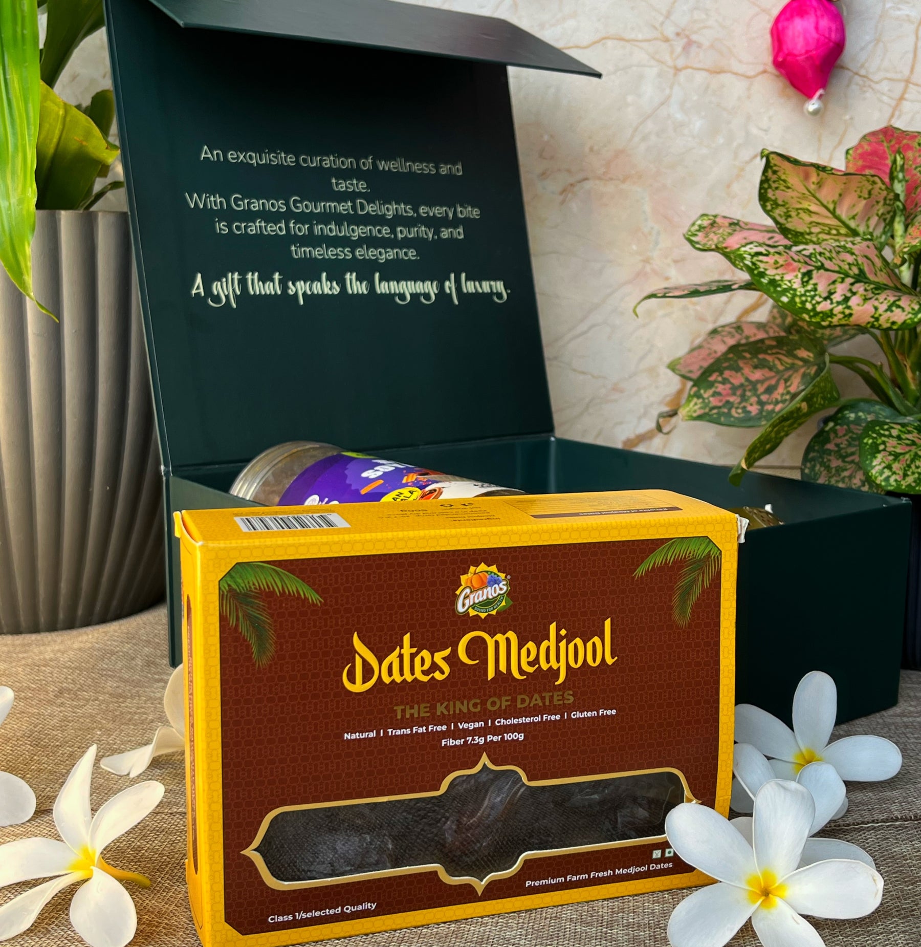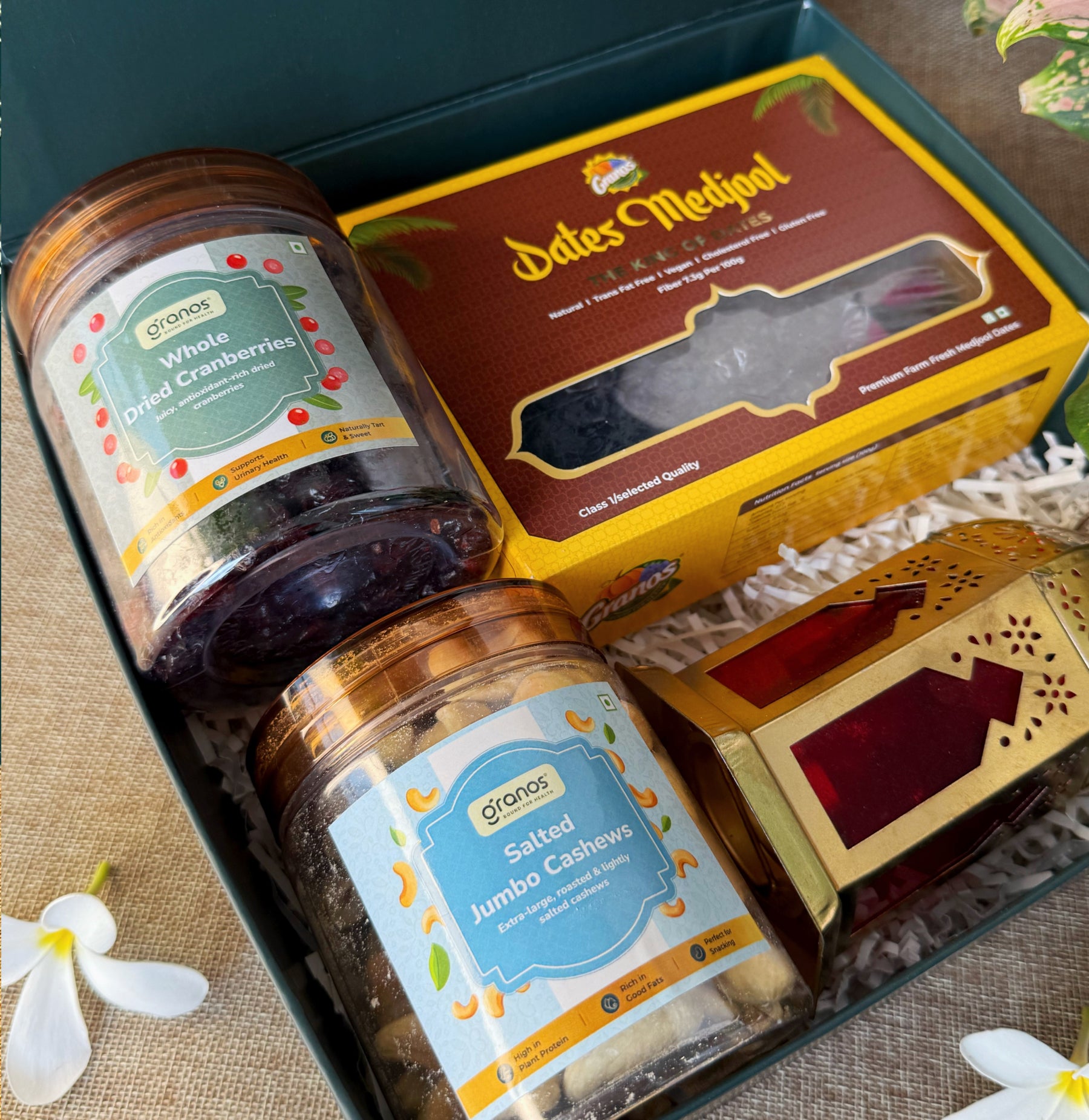 Inclusion: Medjool Dates • Salted Jumbo Cashews • Whole Dried Cranberries • Gift Box/Accessories