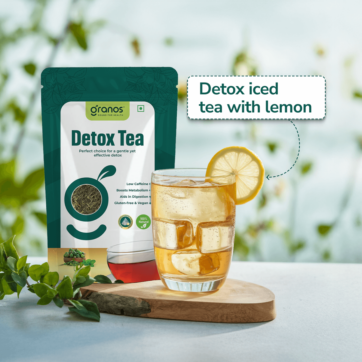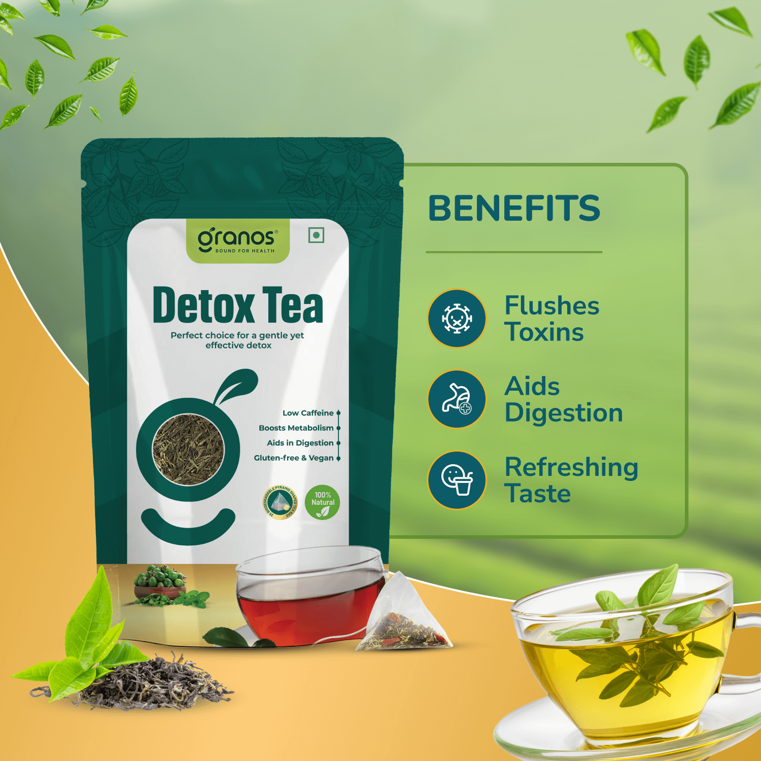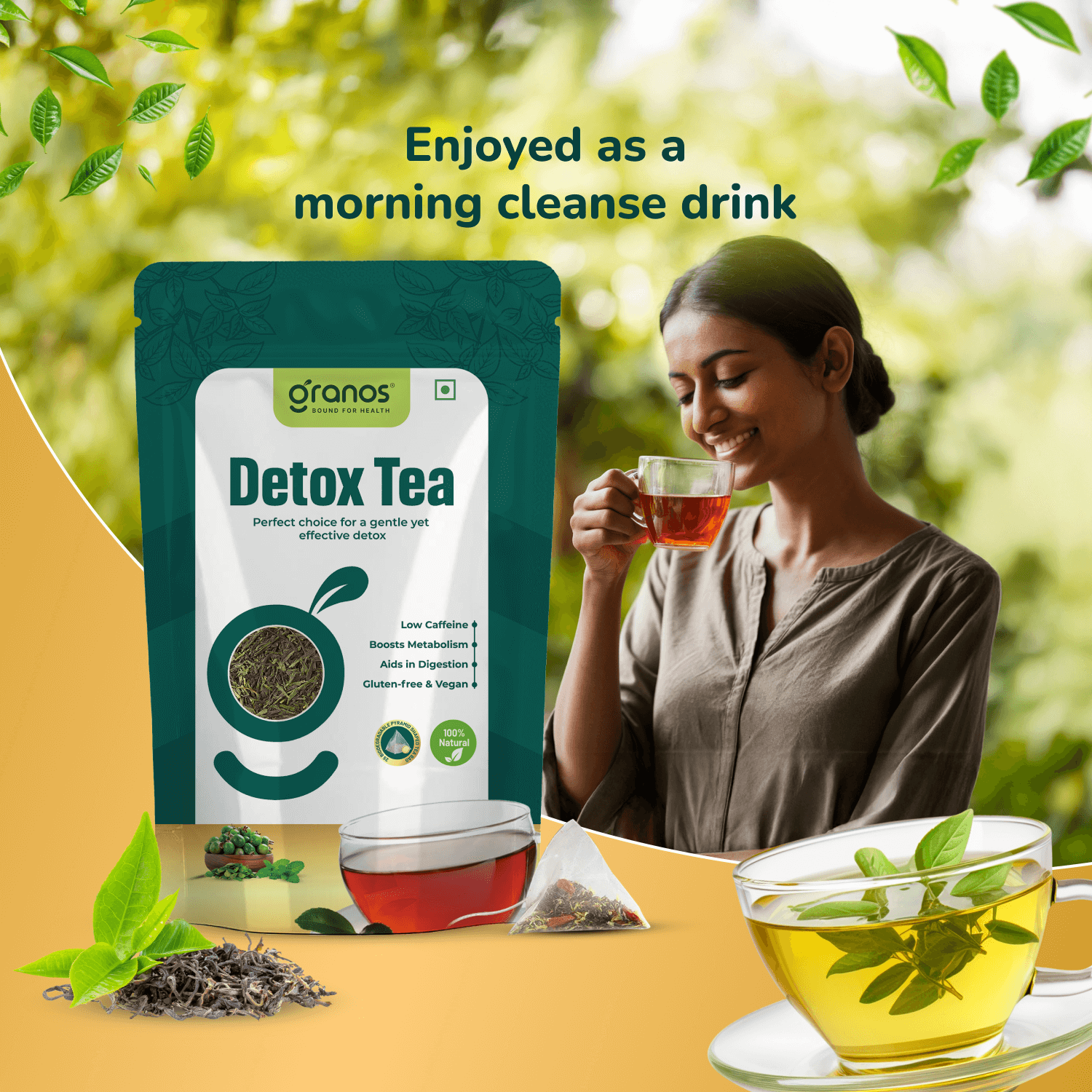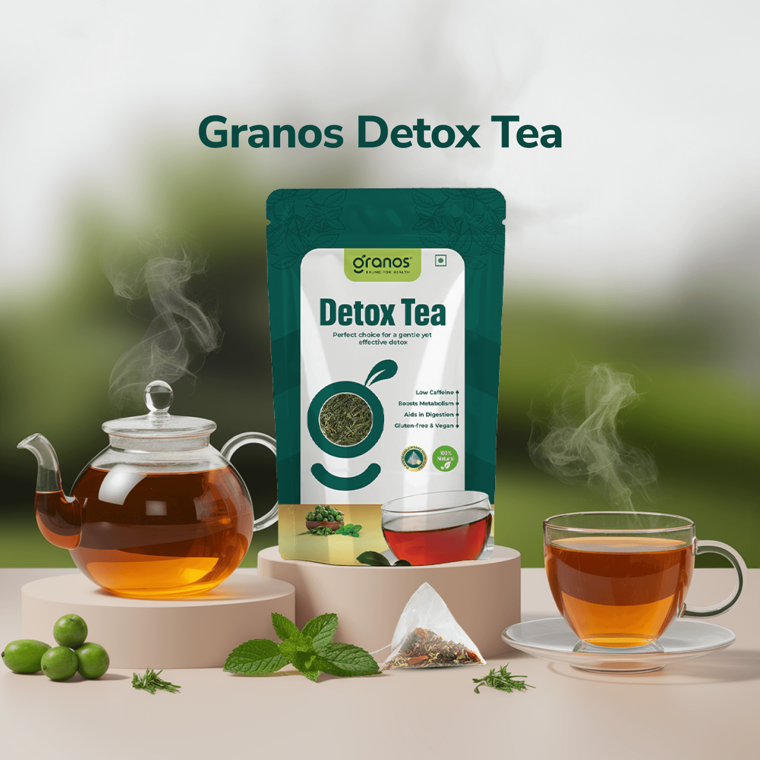 Granos Detox Tea is a thoughtfully curated blend of powerful natural ingredients designed to cleanse your body, boost energy, and promote overall well-being. Combining green tea with superfoods like garcinia, moringa, and rooibos, along with refreshing herbs like lemongrass, tulsi, peppermint, and celery, this detoxifying tea provides a holistic approach to wellness. Infused with senna to aid digestion, it’s a perfect choice for those seeking a gentle yet effective detox. Packaged in eco-friendly tea bags, it’s easy to brew and enjoy at any time of the day.