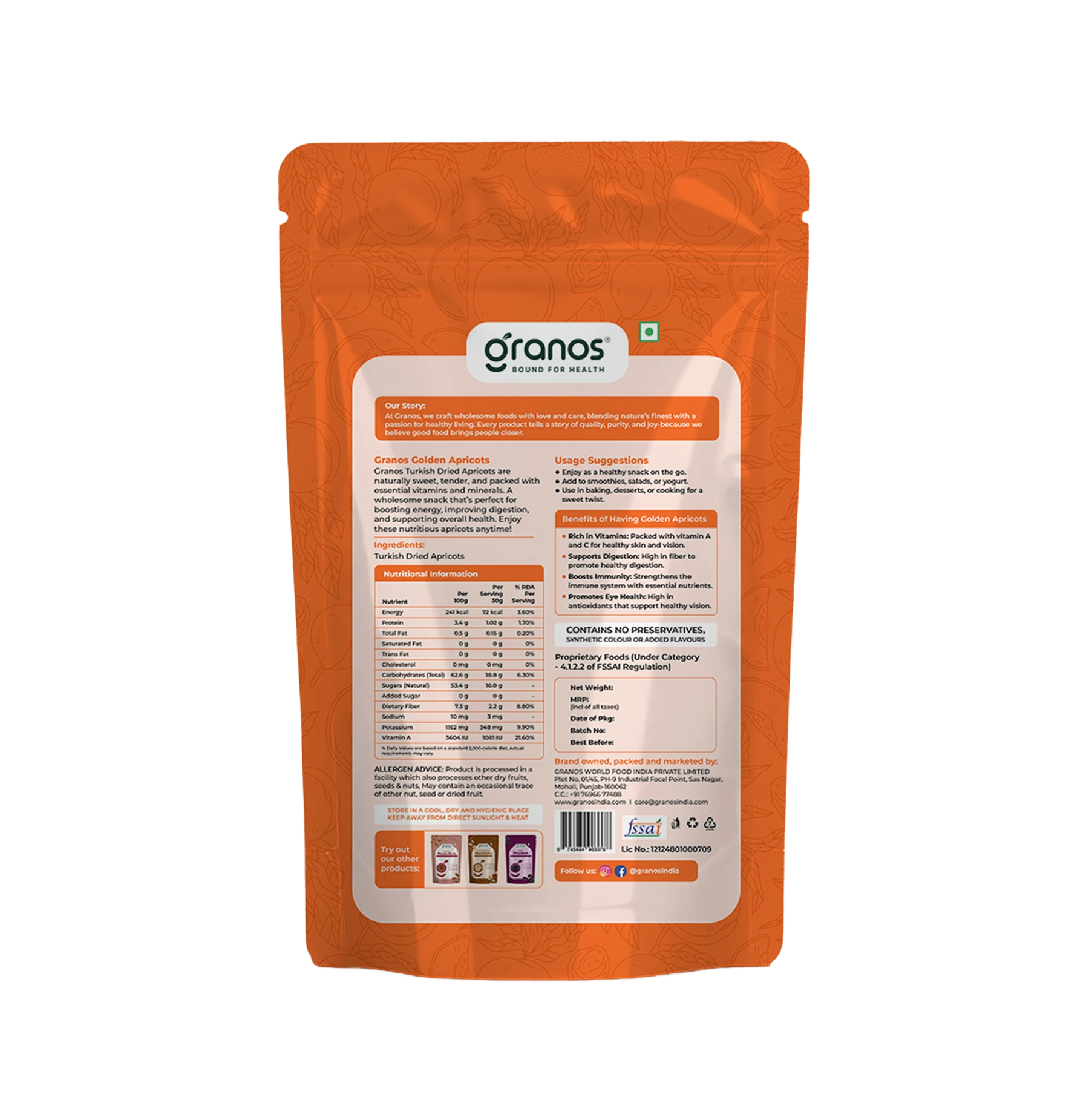 Packed in a convenient zip-lock pouch, Granos ensures long-lasting freshness and allows you to enjoy these apricots for up to 12 months. Apricots are an excellent source of dietary fiber, vitamins, and minerals, making them the perfect go-to snack for health-conscious individuals.