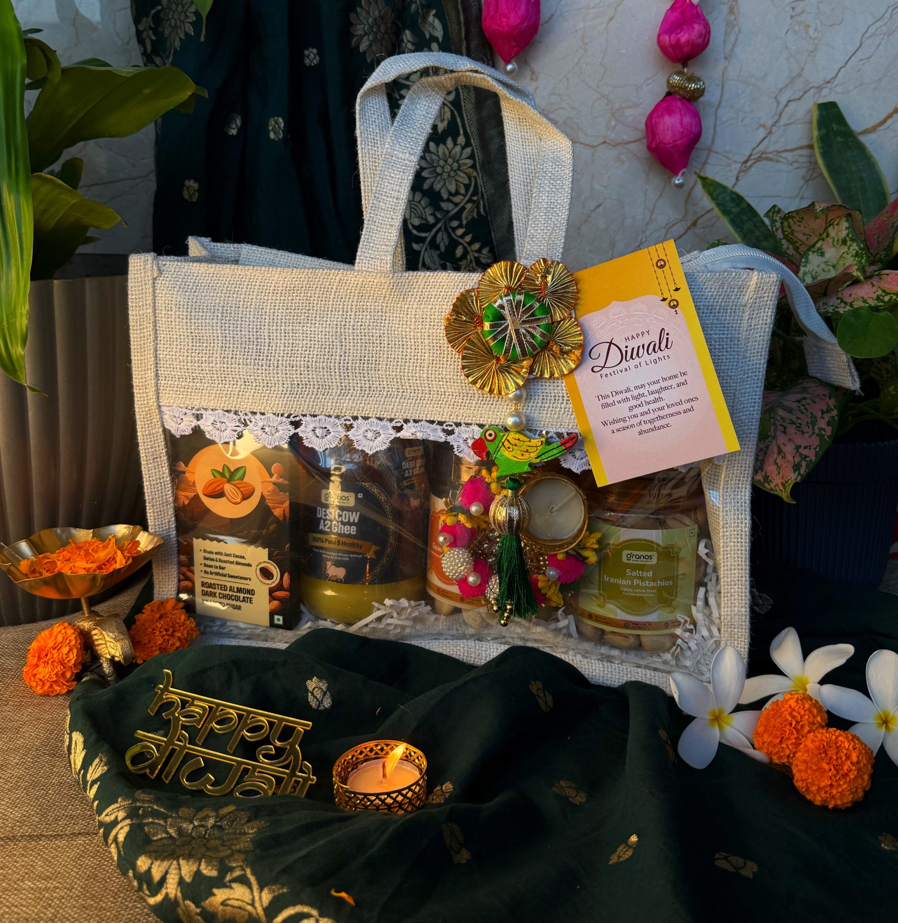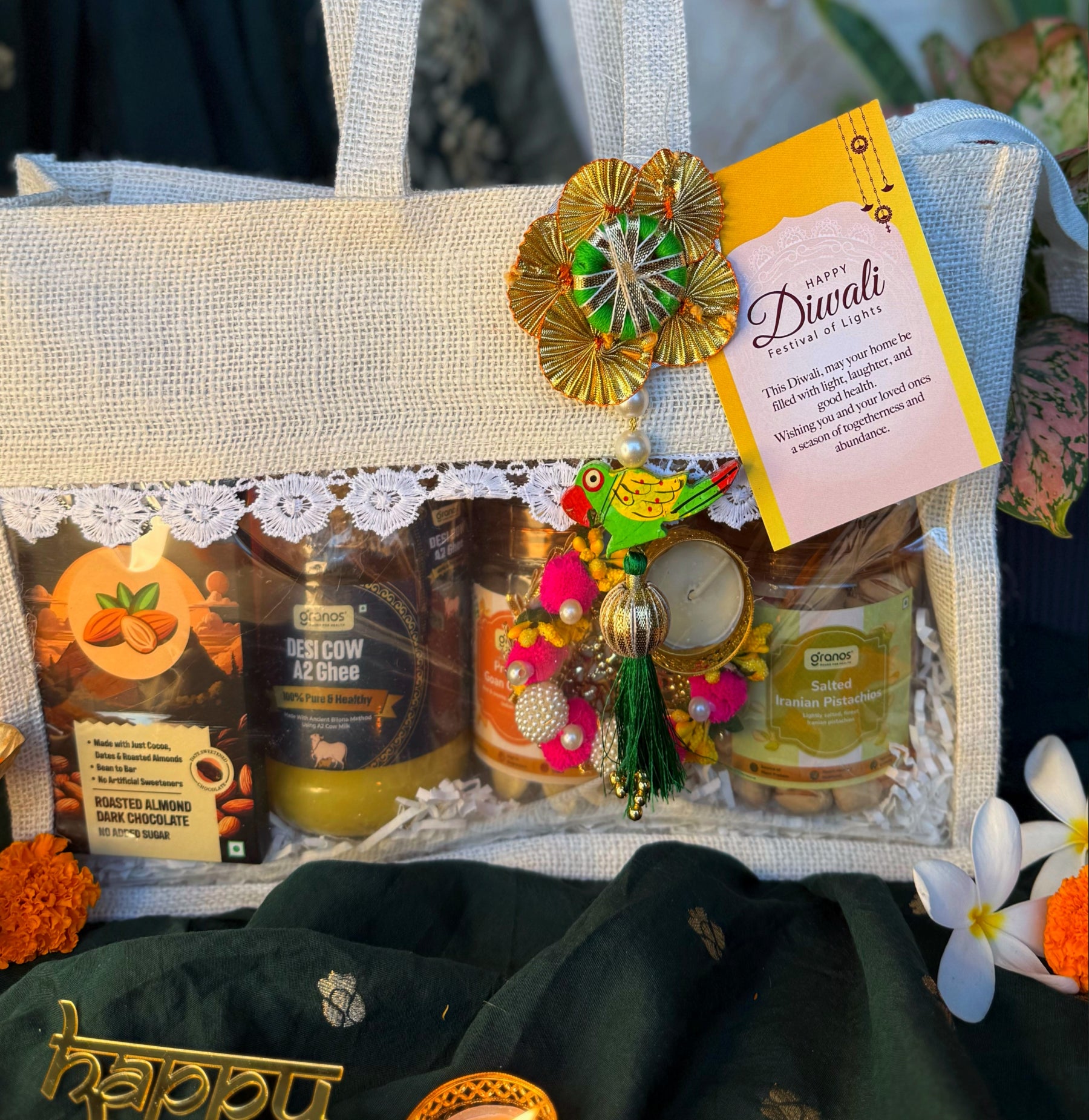 Inclusion: A2 Desi Cow Ghee • Premium Goan Cashews • Salted Iranian Pistachios • NoirDate Orange Dark Chocolate • Gift Bag/Accessories