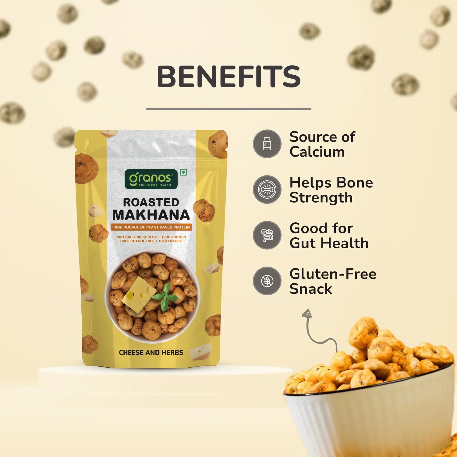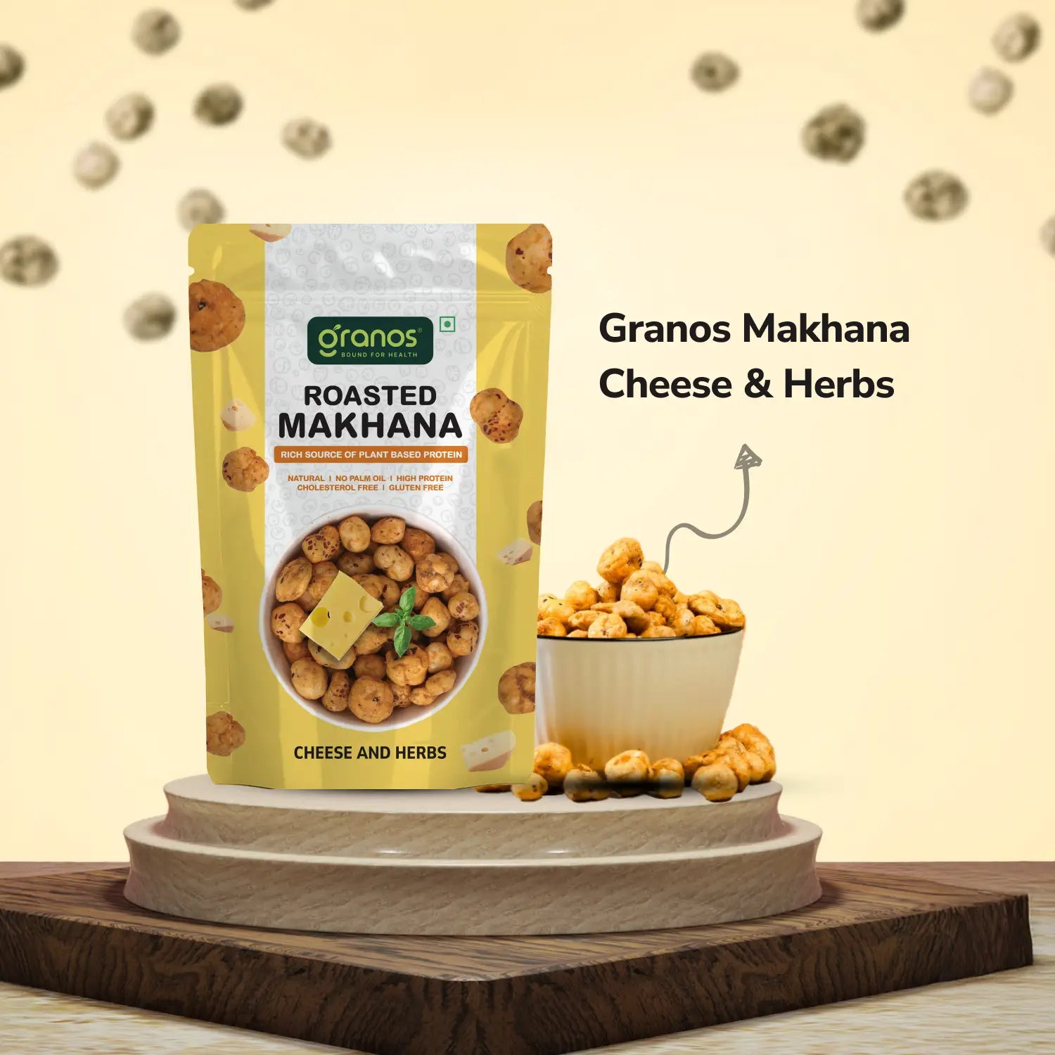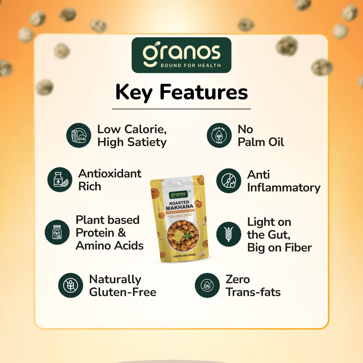 Granos Cheese and Herbs Roasted Makhana is a nutritious and savory snack designed for those who want the perfect blend of flavor and health benefits.