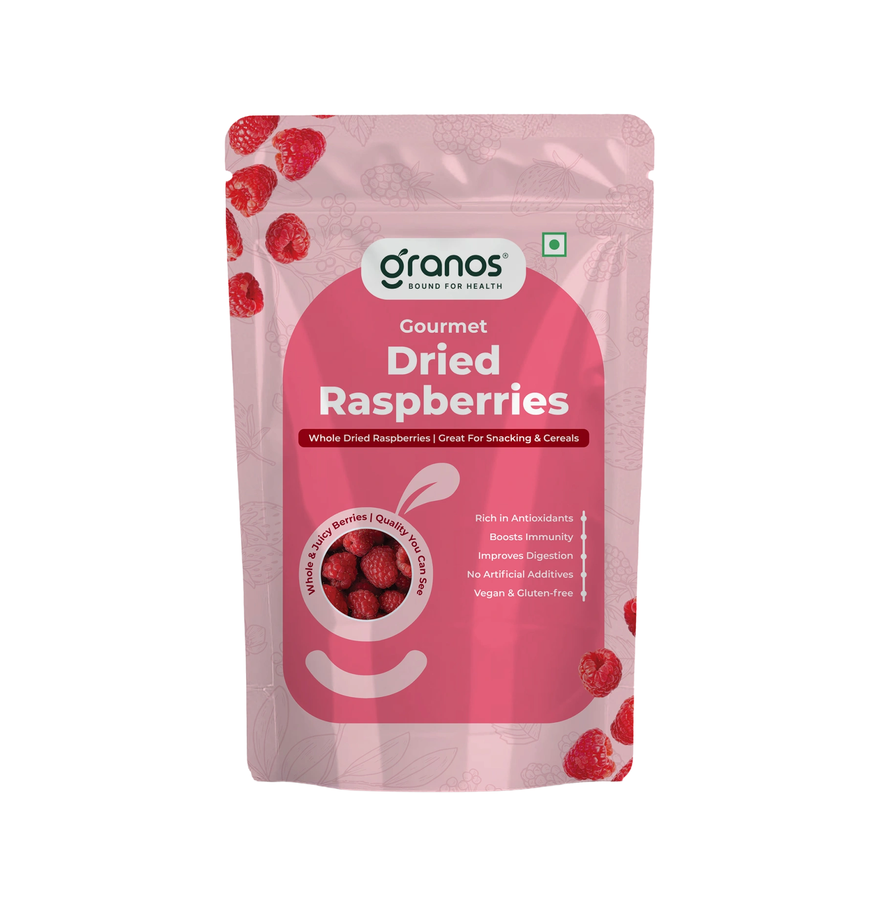 Granos Dried Raspberries offer the perfect combination of health, flavor, and convenience. Our dried raspberries are sourced from the finest berries and preserved carefully, making them a all-round snack you can enjoy guilt-free. Carefully dried to retain essential nutrients and packed in sturdy, resealable zip lock pouches, they stay fresh for longer.