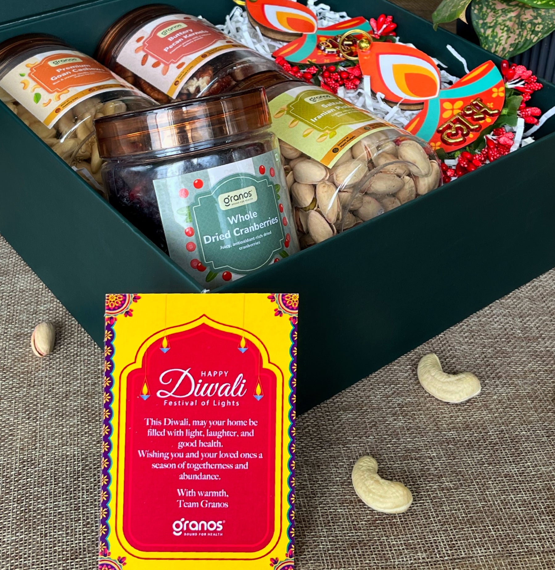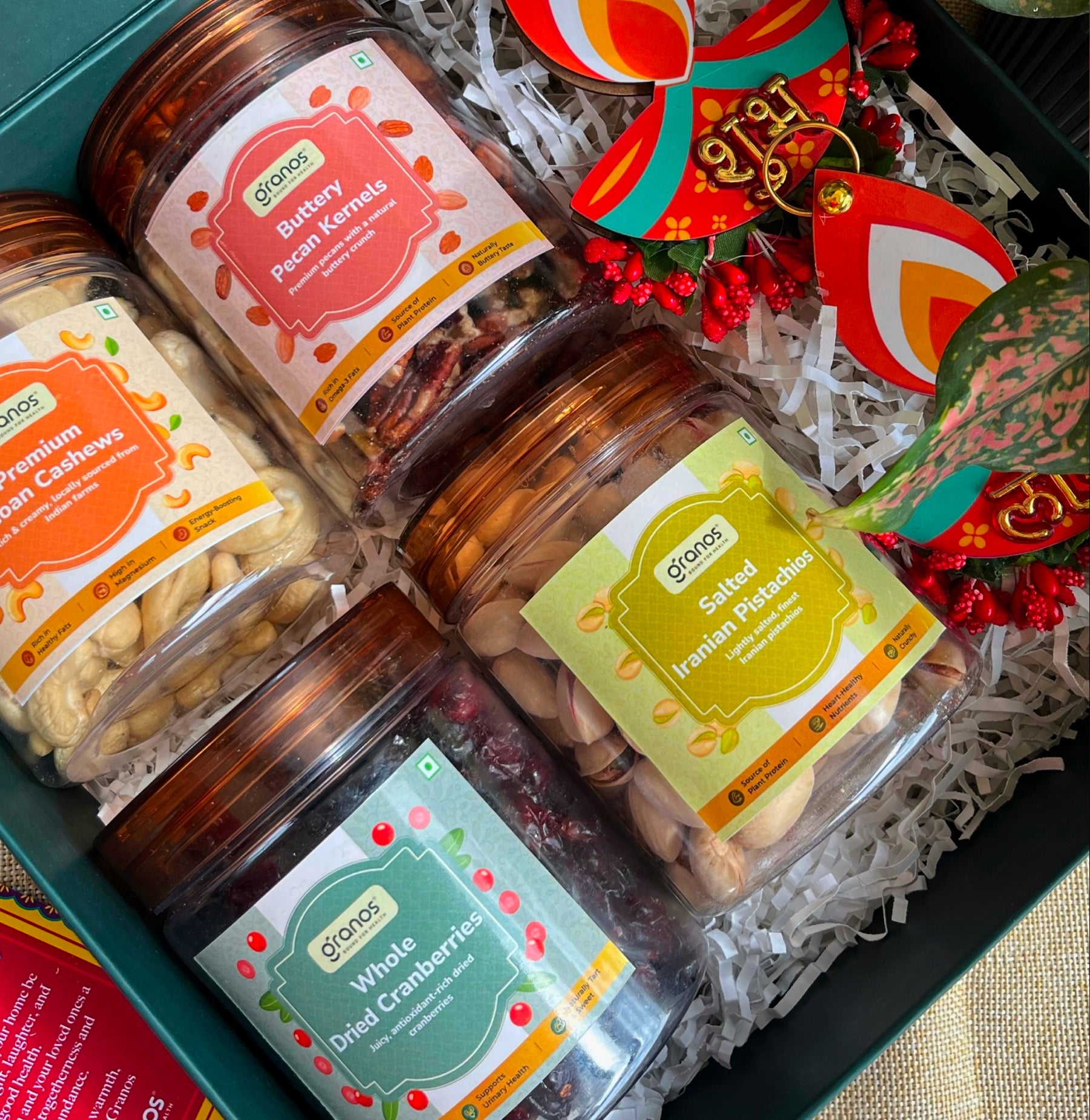 Inclusion: Buttery Pecan Kernels • Whole Dried Cranberries • Premium Goan Cashews • Salted Iranian Pistachios • Gift Box/Accessories
