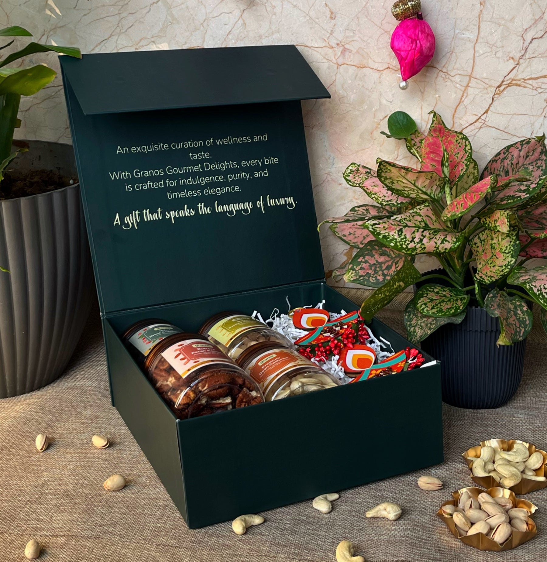 ✨ A gourmet indulgence of buttery pecans, luscious cranberries, premium cashews, and pistachios – elegantly presented in a luxury box for gifting wellness with taste.
