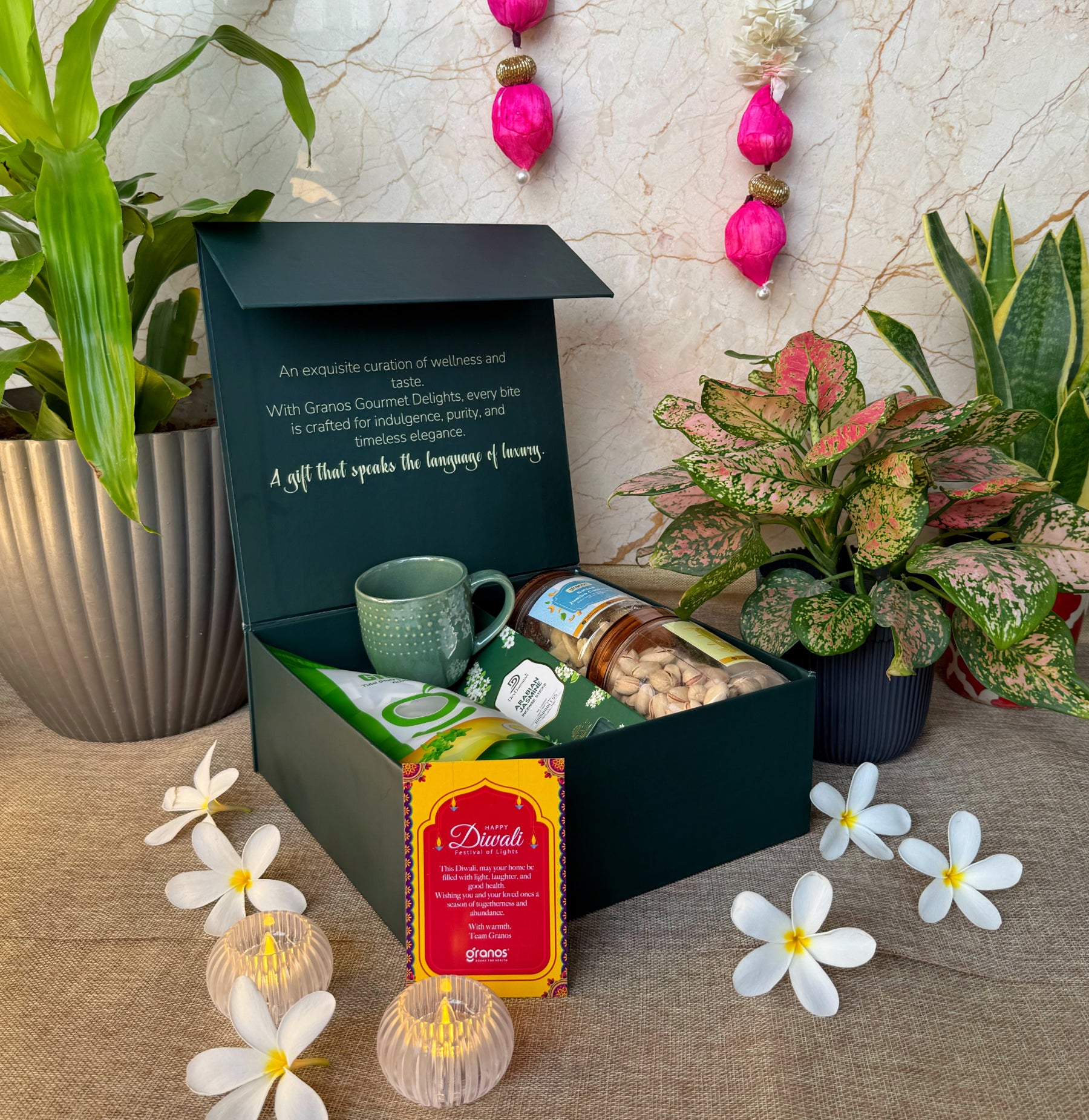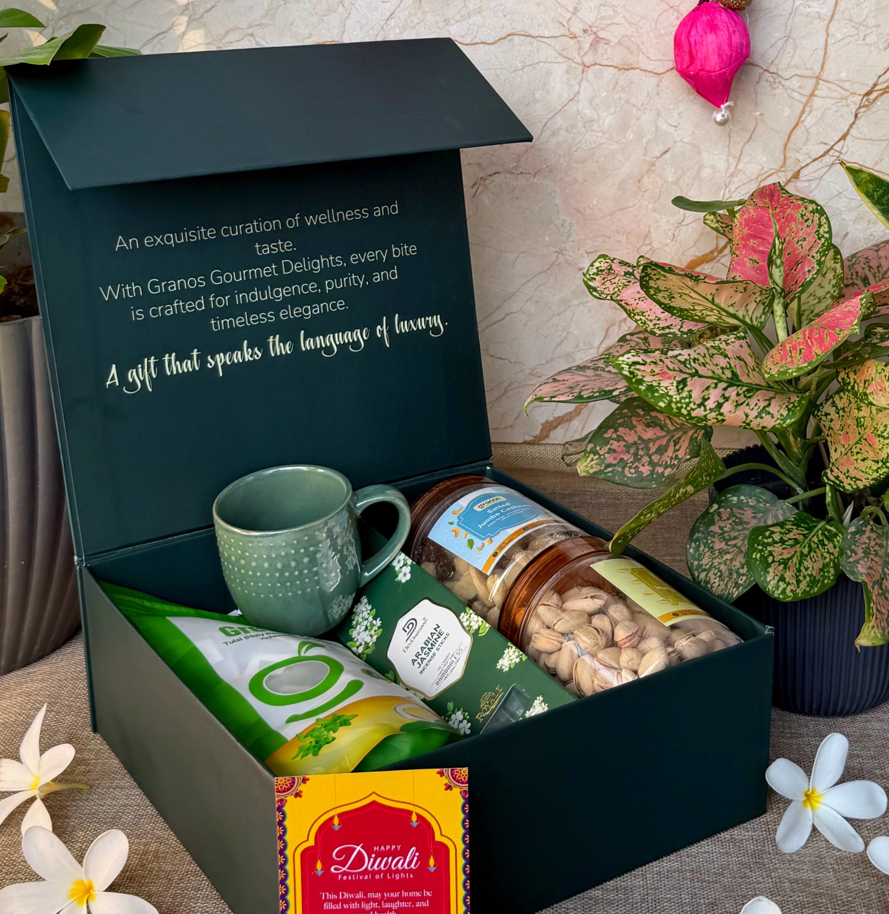 Inclusion: Tulsi Green Tea • Salted Iranian Pistachios • Salted Jumbo Cashews • Cup • Gift Box/Incense Stick