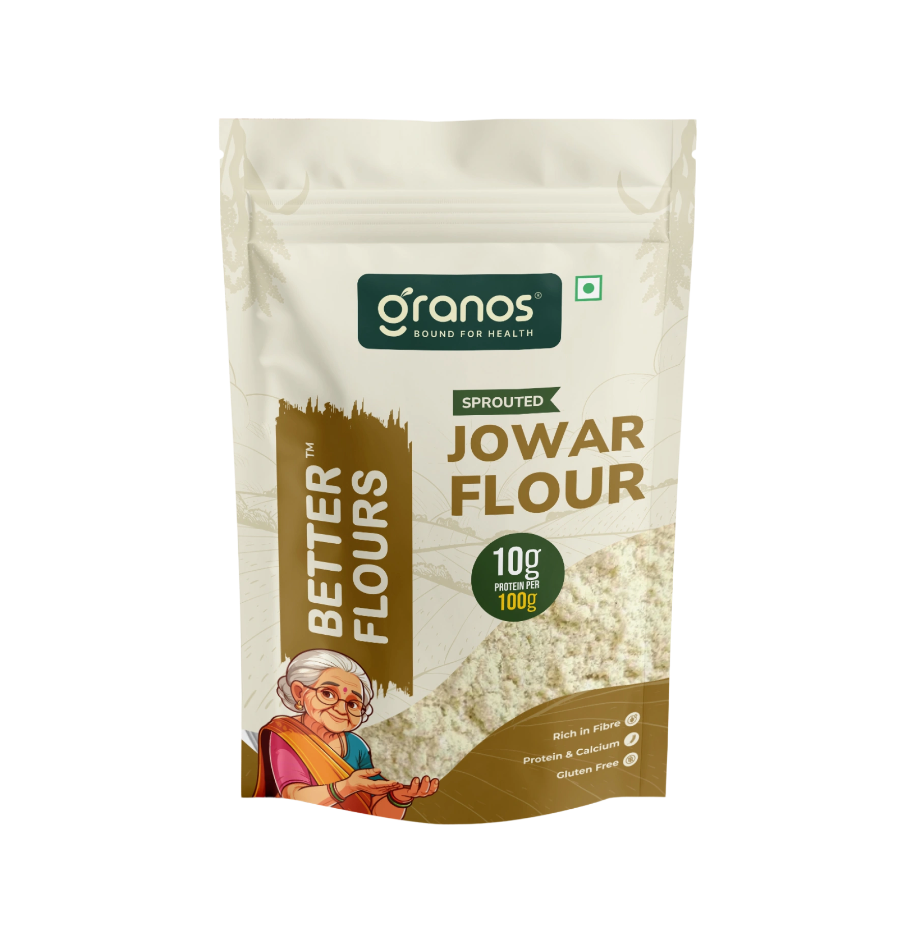 Granos Sprouted Jowar Flour offers a highly nutritious and natural flour choice made from sprouted jowar, also known as great millet. This gluten-free flour is packed with 10g of protein per 100g, making it an excellent source of plant-based protein, perfect for people looking for a high-protein, easy-to-digest, gluten-free alternative. The sprouting process enhances the nutritional profile and bioavailability of key nutrients, ensuring easier digestion and better nutrient absorption.