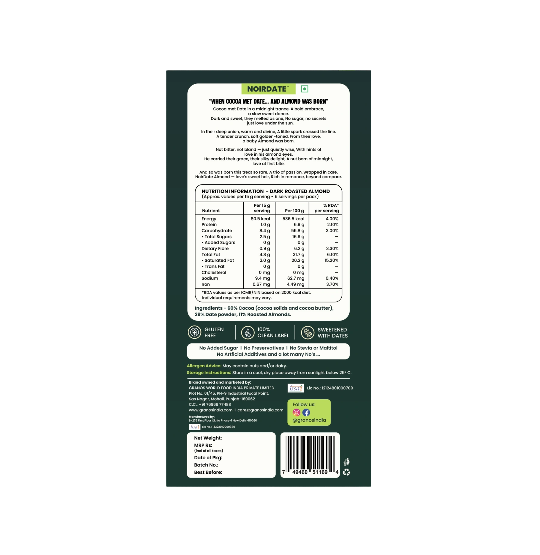 Cocoa Mass 40%, Cocoa Butter 15%, Date Sugar 25%, Roasted Almonds 15%, Cocoa Powder 5%