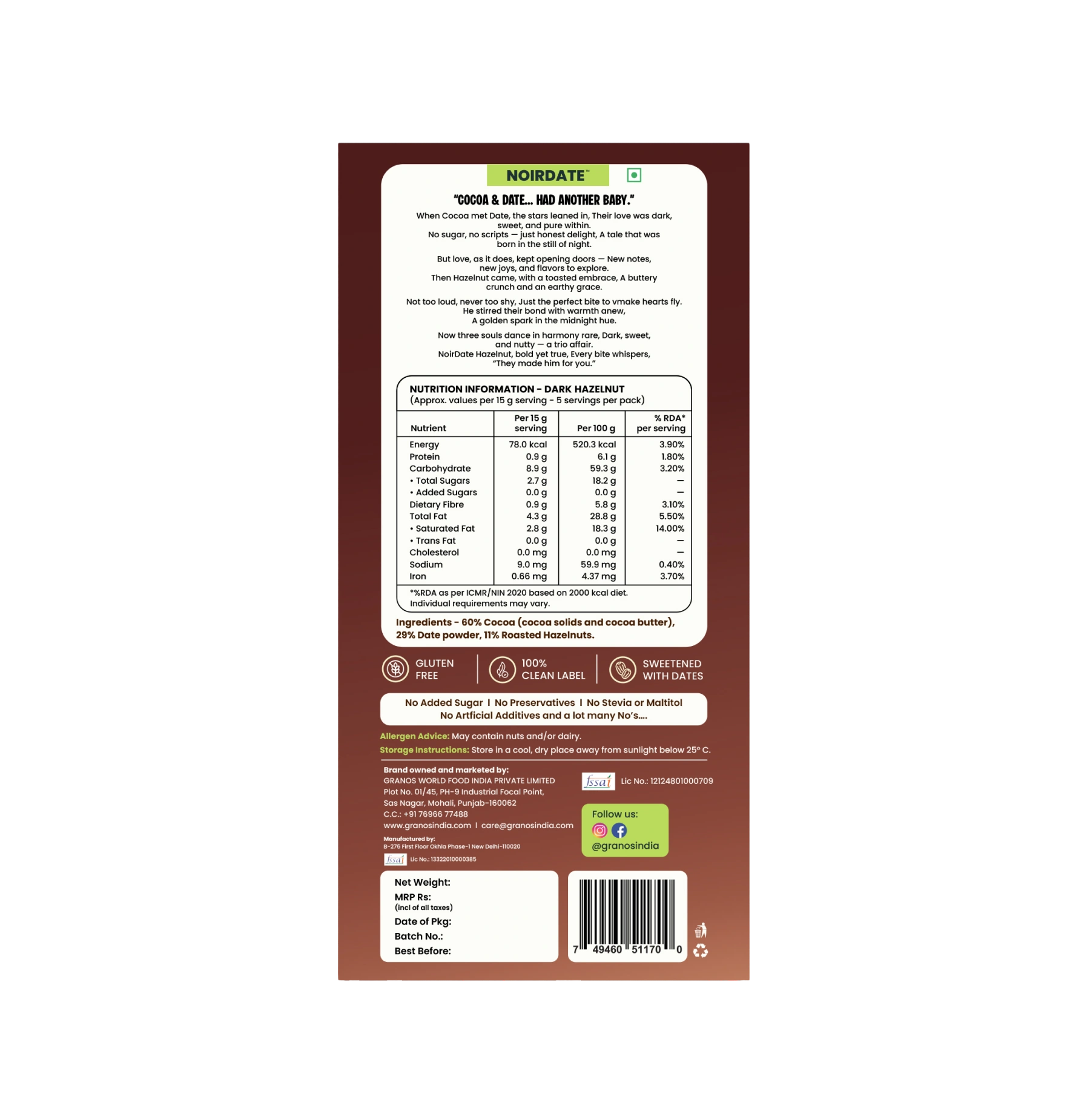 Cocoa Mass 40%, Cocoa Butter 15%, Date Sugar 25%, Roasted Hazelnuts 15%, Cocoa Powder 5%
