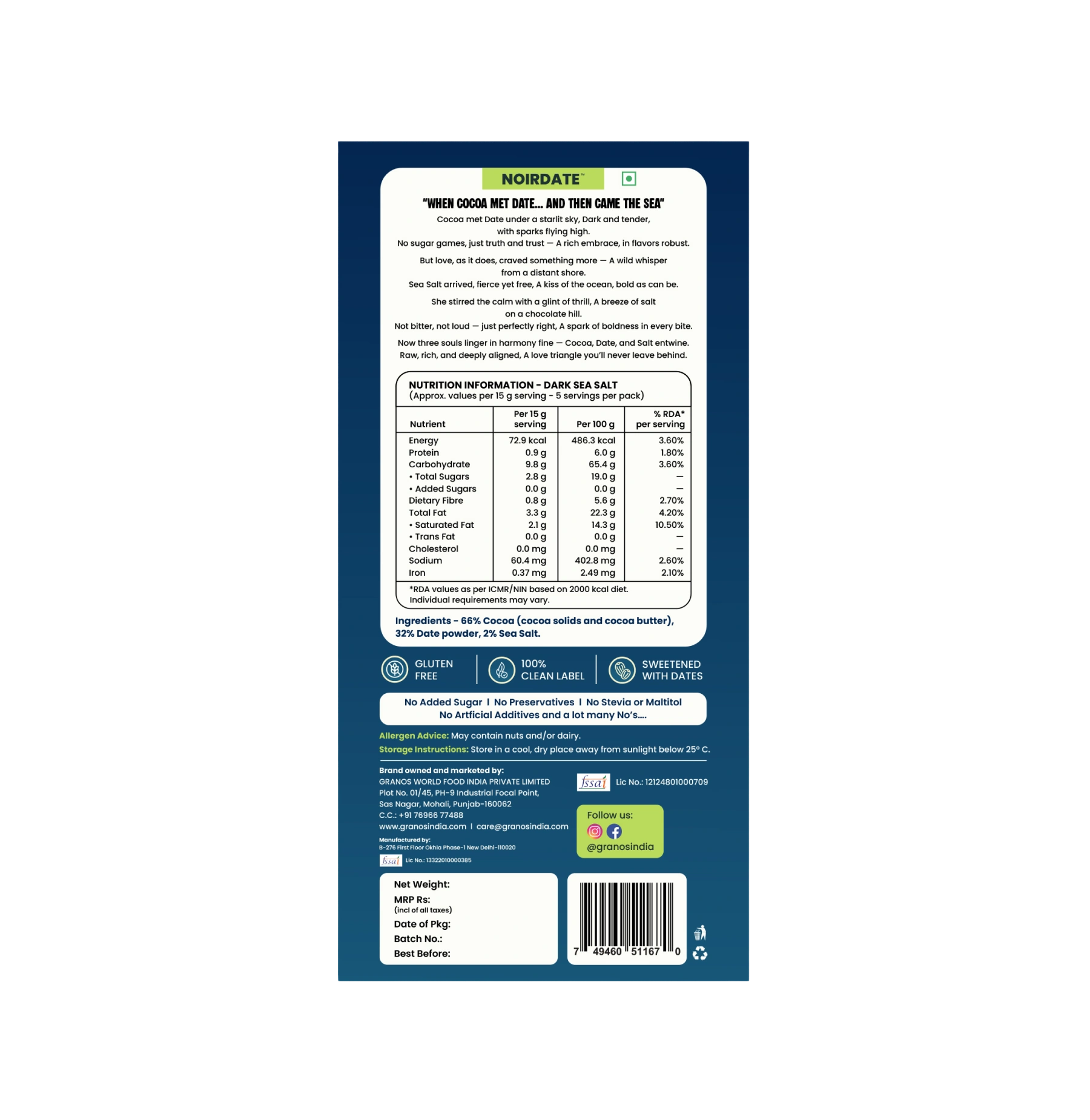 Cocoa Mass 45%, Cocoa Butter 15%, Date Sugar 30%, Cocoa Powder 8%, Natural Sea Salt 2%